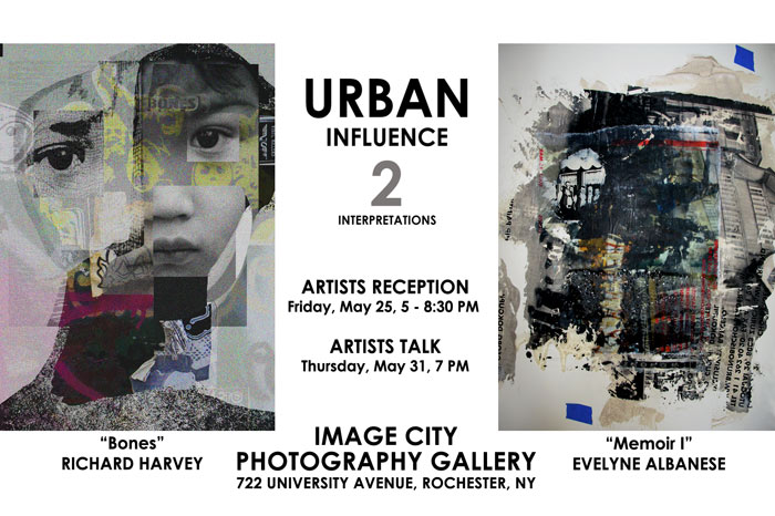 inspiration are cities in the United States and Canada. Albanese revisits, in her photographic element, the Swiss cities of her youth. Harvey incorporates poetry, i.e. "Hope", by Rochester poet Wanda Schubmehl into a large dramatic and poignant image on war and human loss. A wall panel, within the show, will exhibit and explain the multi-faceted sophisticated process. A scheduled Artists Talk, with both artists, will include further elaboration on this process.