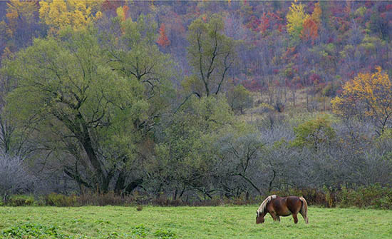 The horse grazes on one of the last warm days of an Indian summer. The trees have shed most of their autumn foliage. A few continue to hang on to the very end of the season. Autumn hues are still visible. Winter snows will arrive soon. For now there is a tranquility to be savored.