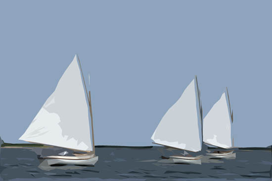 A light wind blows across the bay as the catboats tack abeam of it. The gaff-rigged sail and forward mast require considerable skill by the sailor to manage the boat in the changeable New England weather. While under sail, the catboats provide a colorful and interesting picture as they glide across the smooth waters of Nantucket Bay.