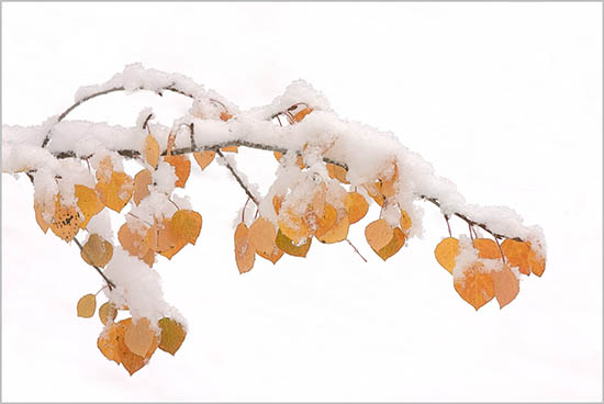 That late September Colorado morning revealed a fresh fallen snow over everything. The fluff had gathered on trees and limbs. The aspen leaves are not yet ready to drop. The snow formed a delicate lace balanced for the moment with the autumn brilliance of the aspen leaves.