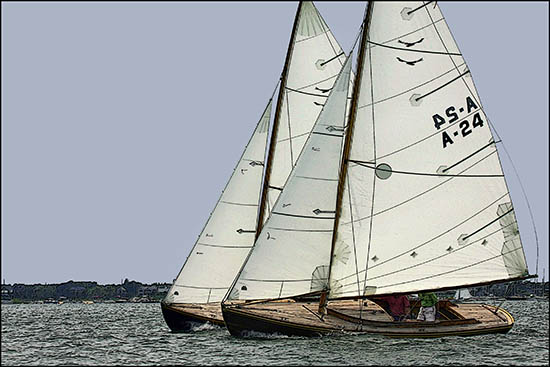 An offshore breeze in Nantucket Bay propels the two sloops on a beam reach. They are only yards apart as they vie for position with the upcoming windward mark. The boat to loo’ard has the right of way, but the windward boat will gradually gain a position advantage. Can it capture that advantage before the mark? On the other hand, will the windward boat let the opponent round first, and perhaps gain an upwind advantage for the next mark? Will the lee boat sail up to force the windward to give clearance? The drama is set. The race is on.