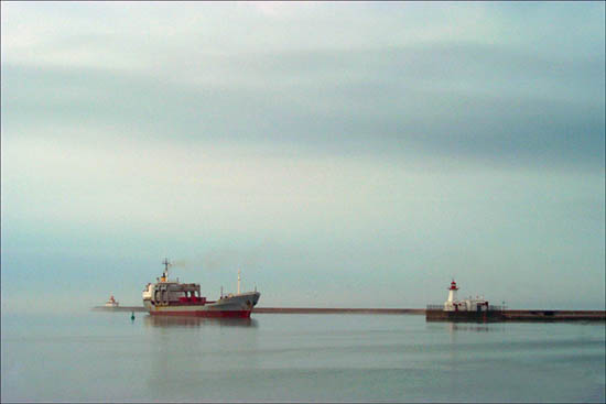The morning is so very still. The lake surface is like polished glass. MV Menominee has had clear steaming the length of Lake Erie. It is now entering the outer harbor of Port Colborne, Ontario. It will continue its journey down the Welland canal, to Lake Ontario, and finally to its destination port, Örnsköldsvik, Sweden. The deep bass rumble from the ship’s engines penetrates the stillness. The sound, felt more than heard, further amplifies the depth of the morning calm.